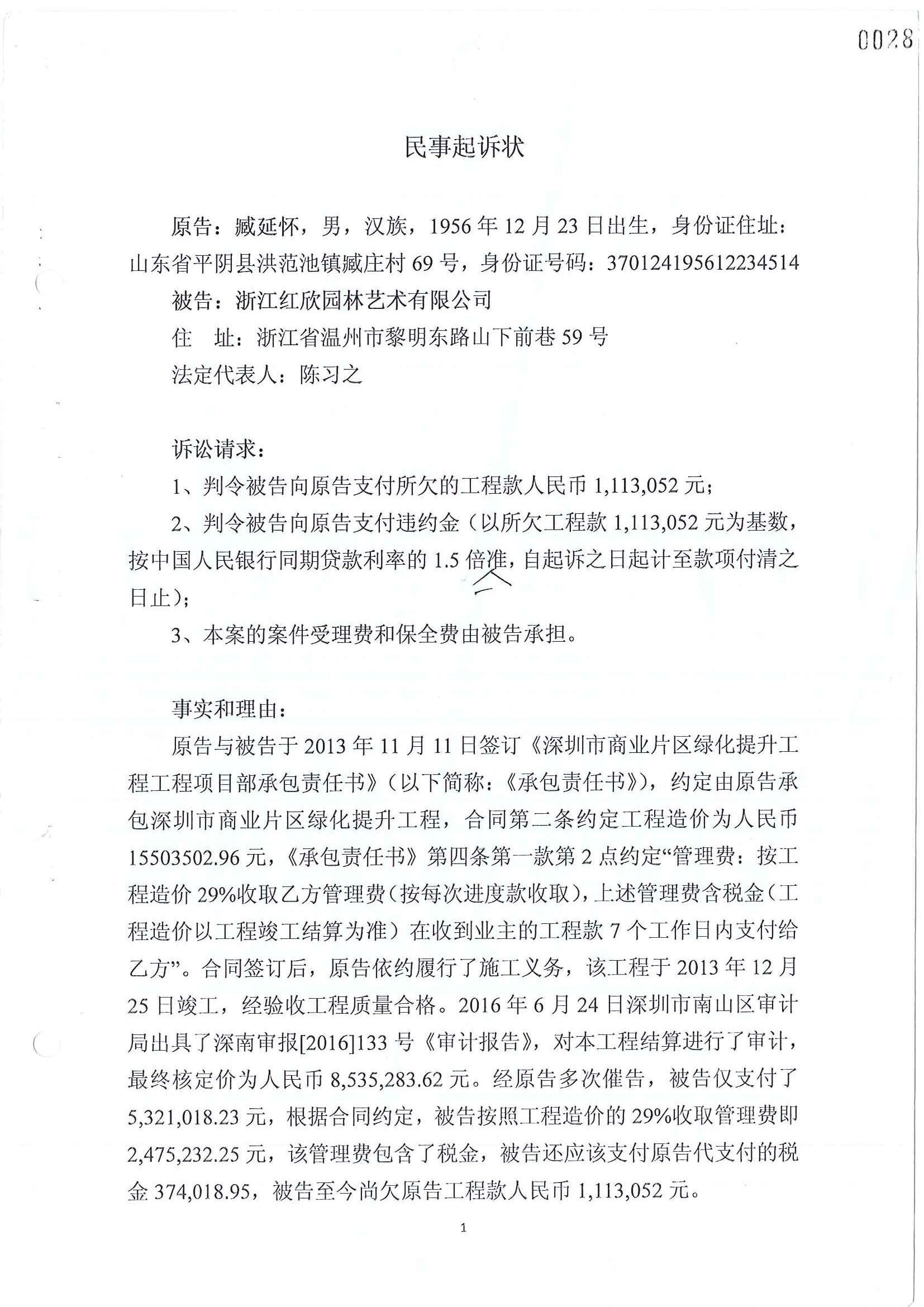 关于我司(深圳市园林工程有限公司)涉案(案号为2017浙0302民初808号)的情况说明如下:我司臧延怀先生与浙江红欣园林艺术有限公司(以下简称“浙江红欣公司”